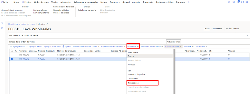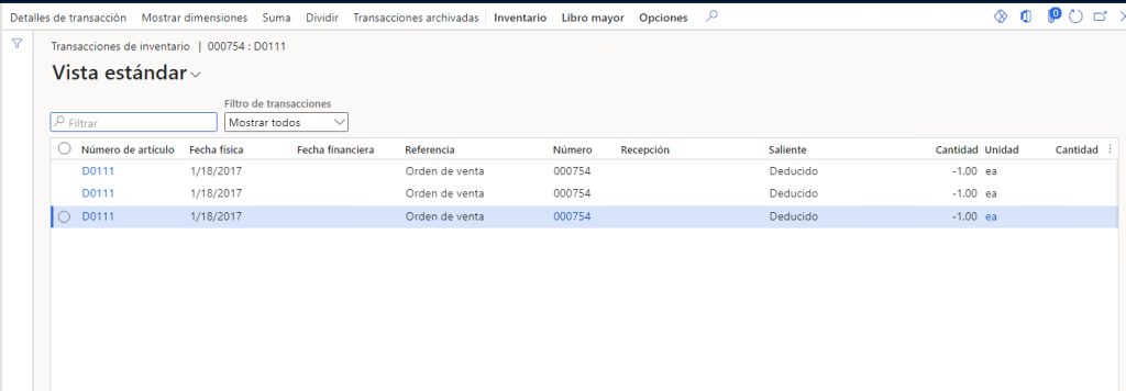 Uno de los ejemplos más comunes de nuestro día a día, son las Ordenes de Venta, cuando nosotros generamos las líneas de la orden, capturamos los datos correspondientes a los artículos considerando dimensiones de inventario, dimensiones de almacenamiento, cantidades, y de más características, desde ahí se termina generando ya una transacción de inventario con cierto estado, para poder comprobarlo nos ubicamos sobre la línea de Orden de Venta y nos vamos a la ruta mostrada en la siguiente Imagen: