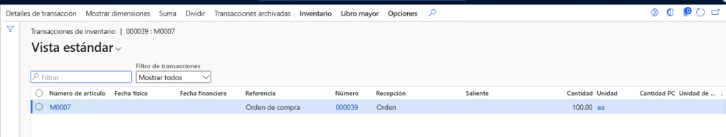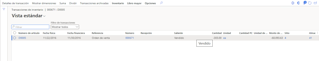 Una vez ubicados sobre esa ruta podemos visualizar las transacciones correspondientes a esa línea de Orden de venta: