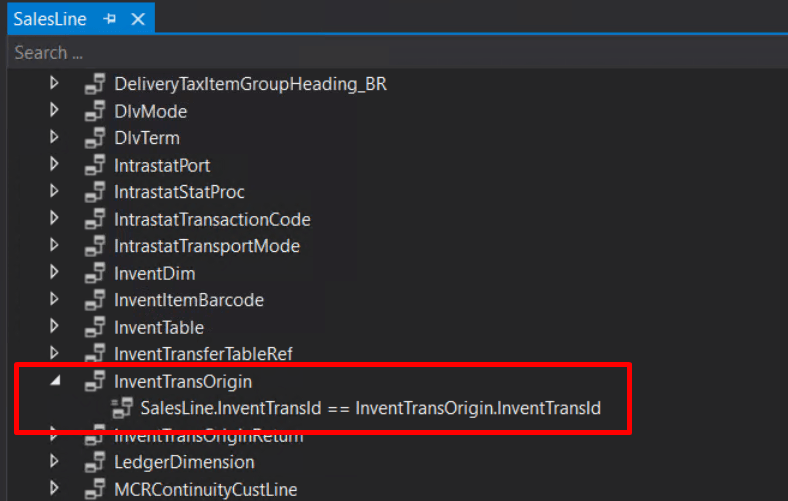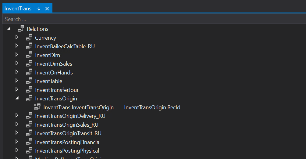 Con esto podemos deducir que para poder recuperar los registros de la inventTrans debemos hacer una consulta tomando como partida el campo InventTrans de la tabla que nos interesa recuperar sus transacciones, hacia la inventTransOrigin y de ahi a la InventTrans, considerando su relación como se muestra en la siguiente imagen: